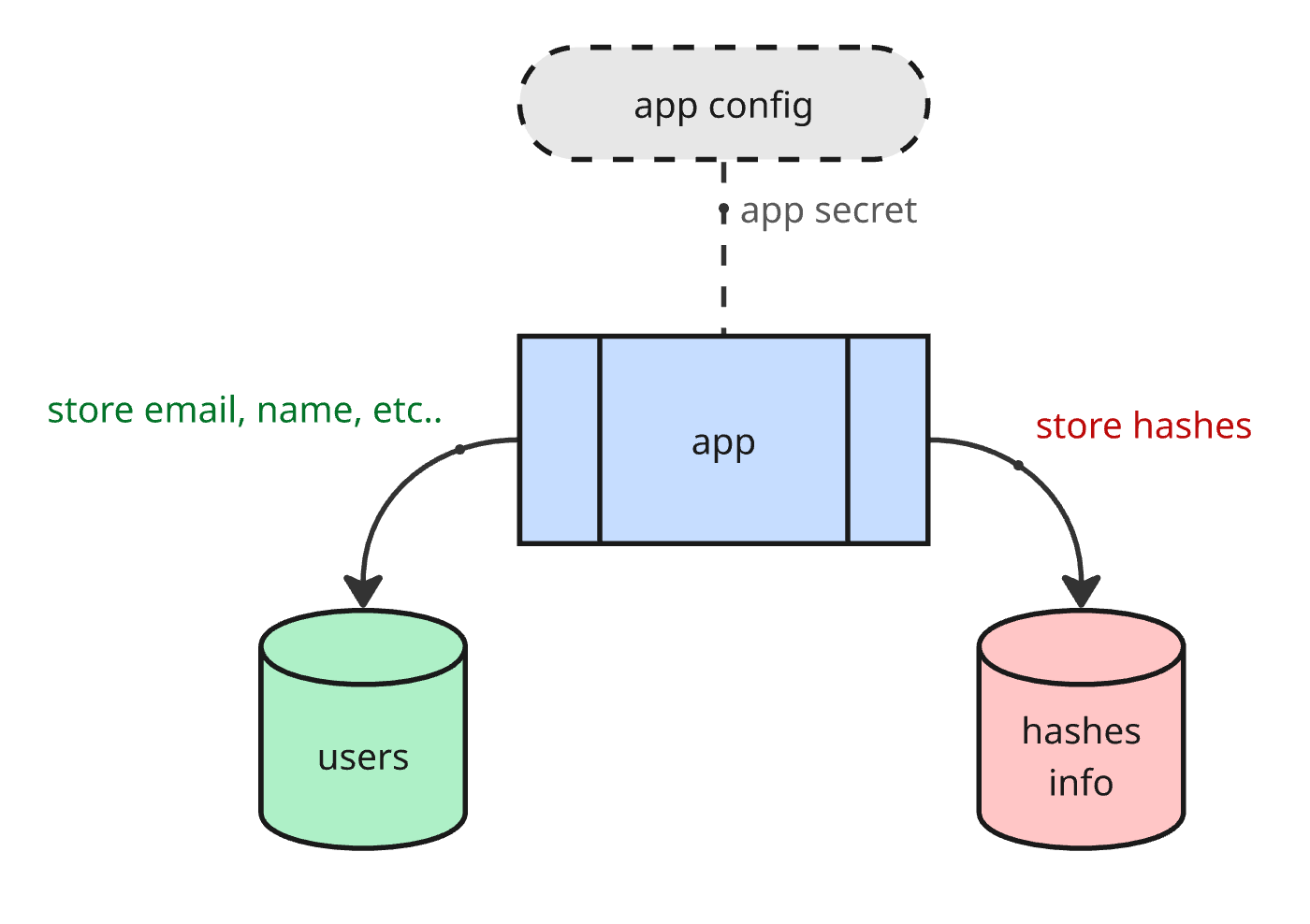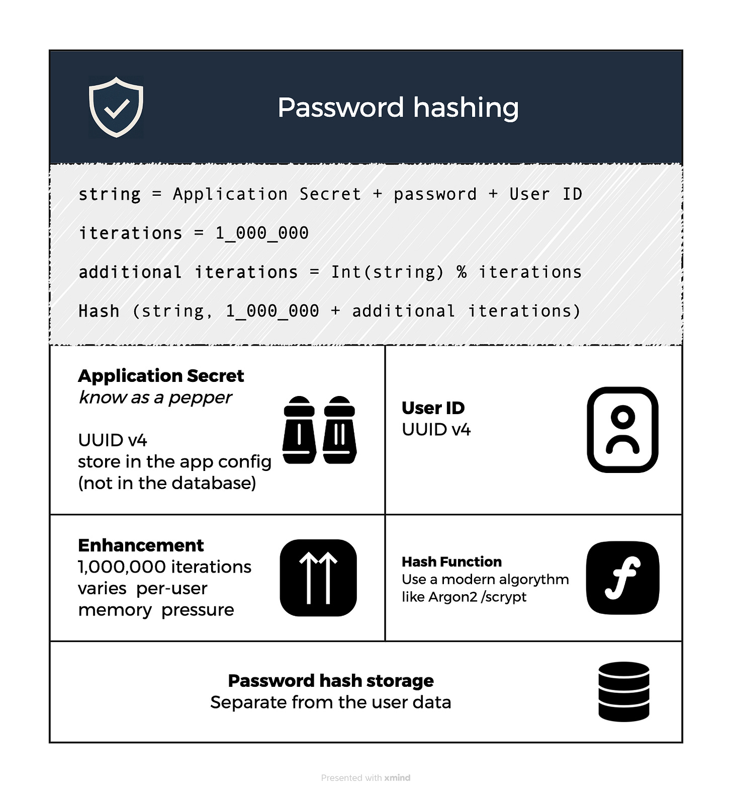 Application Secret – is an additional secret (peppering) used alongside a password at the application level. If password hashes are leaked, attackers will need not only the list of passwords but also the specific secret used by each user. Requirements: UUID v4 minimum, the secret is stored exclusively in the application configuration, not in the database (good example – HashiCorp Vault)